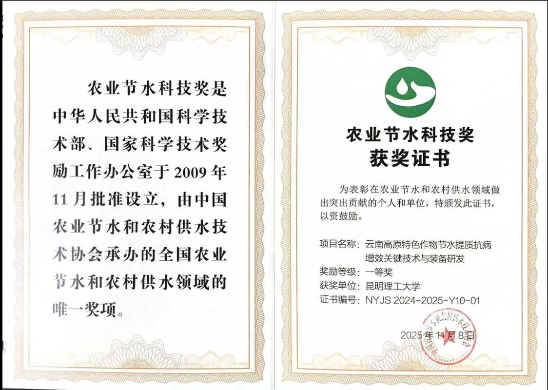 2025年11月7-9日,2024-2025年度(第十届)农业节水科技奖颁奖大会“大北农杯”在广东融创施柏阁会堂隆重举行。以昆明理工大学、大禹节水集团股份有限公司(云南)、河南科技大学、云南行知协同农业科技有限公司共同完成的“云南高原特色作物节水提质抗病增效关键技术与装备研发”项目荣获农业节水科技奖一等奖。昆明理工大学现代农业工程学院教授/云南省农业水资源高效利用与智慧管控重点实验室主任杨启良、团队成员梁嘉平、韩焕豪、袁勇、唐振亚、李加念、刘小刚分别为该成果的第一、第二、第六、第十一、第十二、第十三、第十四完成人。