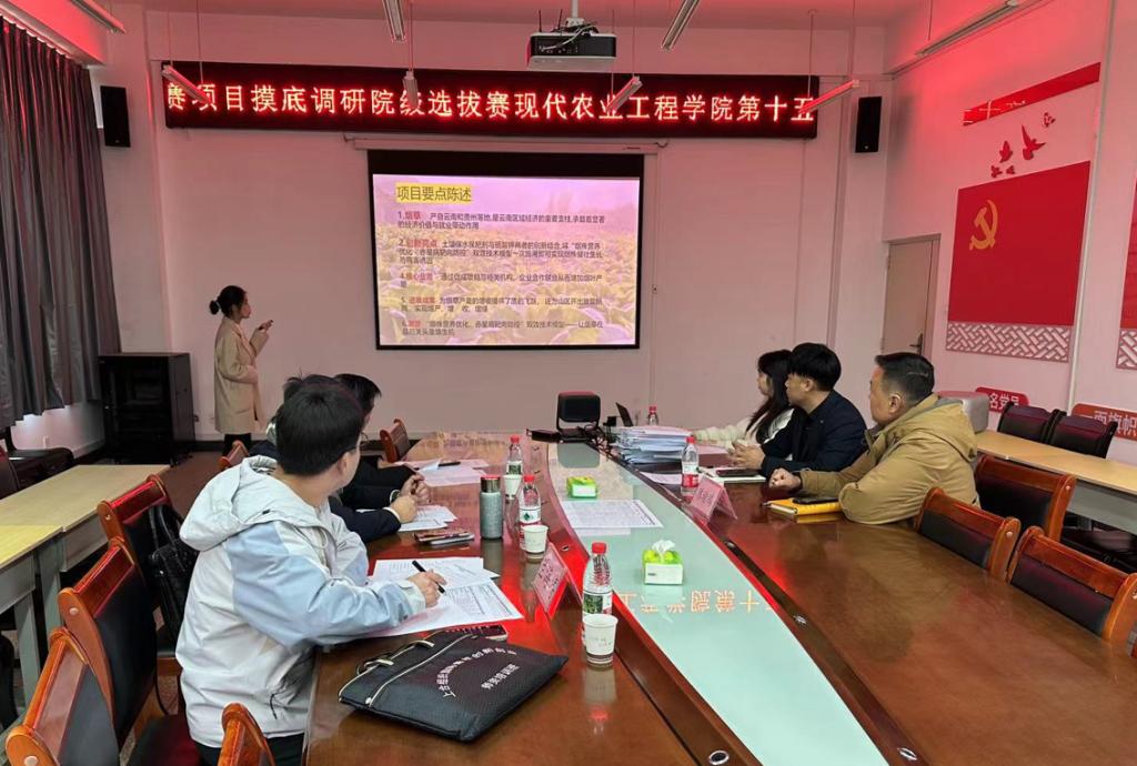 2025年11月20日,现代农业工程学院举办了第十五届“挑战杯”中国大学生创业计划竞赛备赛项目摸底调研院级选拔赛。学院邀请了滇西应用技术大学创新创业学院院长钟家玉、中国高校创新创业产业投资联盟 教育部全国高校毕业生就业创业指导委员会委员兰海涛、云南永合国际贸易有限公司总经理兼昆明理工大学校外创业导师史明圆等资深专家担任本次选拔赛评委。